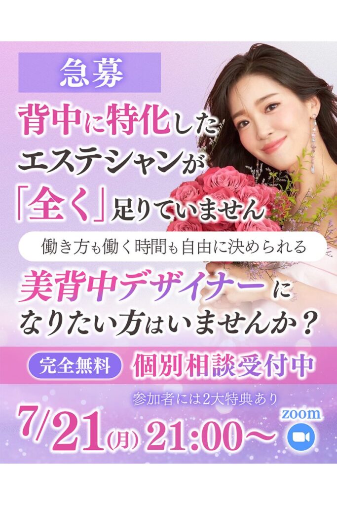 【デザイン概要】ターゲットは美容に興味がある女性。クライアント要望のカラーを元に、女性らしさと上品さを担保しつつ、ひと目でテーマが伝わる構成にしました。実績・権威性(箇条書き)をまとめ、信頼の裏付けを短時間で認知できる導線に。憧れと成功がイメージできるデザインにしました。