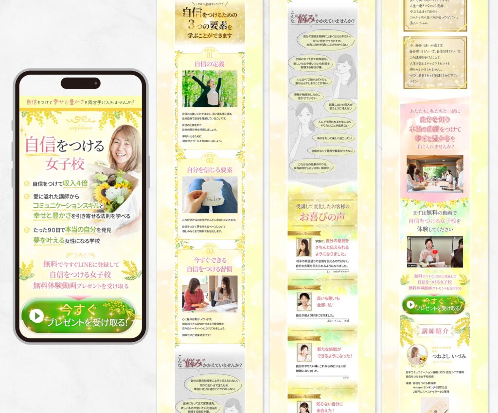【デザイン概要】ターゲットは自己啓発に興味がある30〜50代女性。クライアント様のご要望でイエローと花モチーフを元に制作。「自信」という大きなキーワードを、明るいイエロー×ゴールドを基調に前向きな変化を感じられるように表現しました。